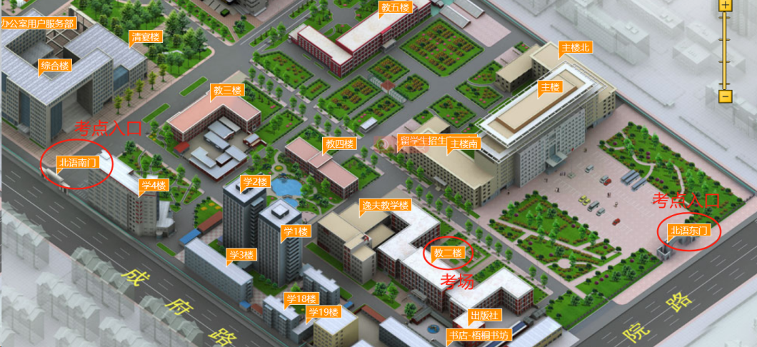 考生入口:由学校东门或南门进校,具体位置见图1。