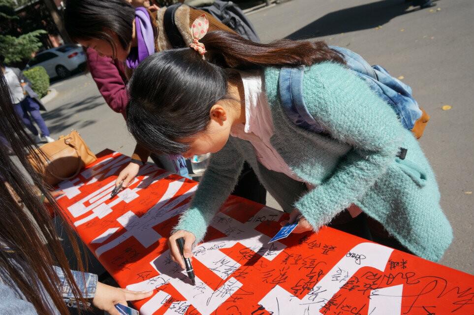 2014年10月16日中午,由北京语言大学校研会学术部举办的“遵守学术道德、恪守学术规范”承诺签字活动在校主干道十字路口展开。该活动主要通过签字形式,督促同学们养成良好的校园学术氛围,保持和发扬北语的优良学风,维护学术道德,严明学术纪律,规范学术行为,提高学术质量。